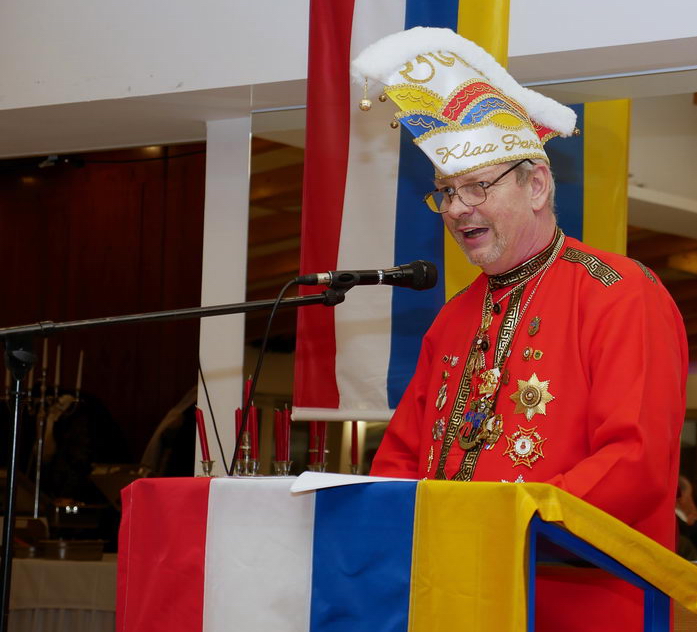 Im Anschluss würdigte Thomas I. die über 34 jährigen Verdienste von Dietmar Pontow und übergab das Geschenk der Zuggemeinschaft. Der Urnarr (auf dem Klaa Pariser Fastnachtbrunnen am H.P. Müller Platz zu sehen) welcher als Unikat aus Eschenholz geschnitzt wurde und mit dem Schild des neuen Eigentümers bestückt nun übergeben wurde, rührte den scheidenden Vorsitzenden zu Tränen. Ebenso bedankte sich die Zuggemeinschaft bei seiner Frau Ingeborg und den Töchter Alexandra und Michaela, welche über Jahrzehnte auf ein – in der Kampagne – spärliches Familienleben blicken können.